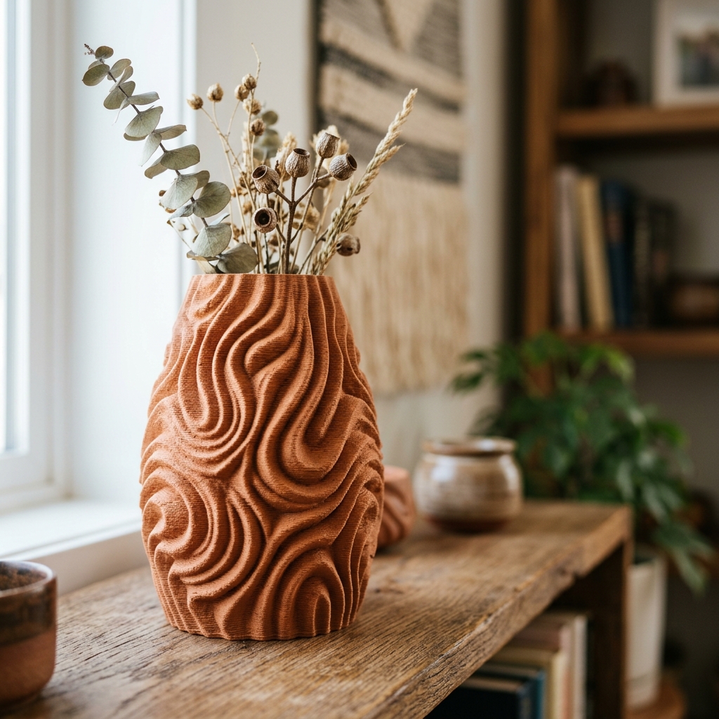 Элегантная ваза с плавными органичными линиями, имитирующими водную рябь. Прекрасно смотрится в скандинавском интерьере.